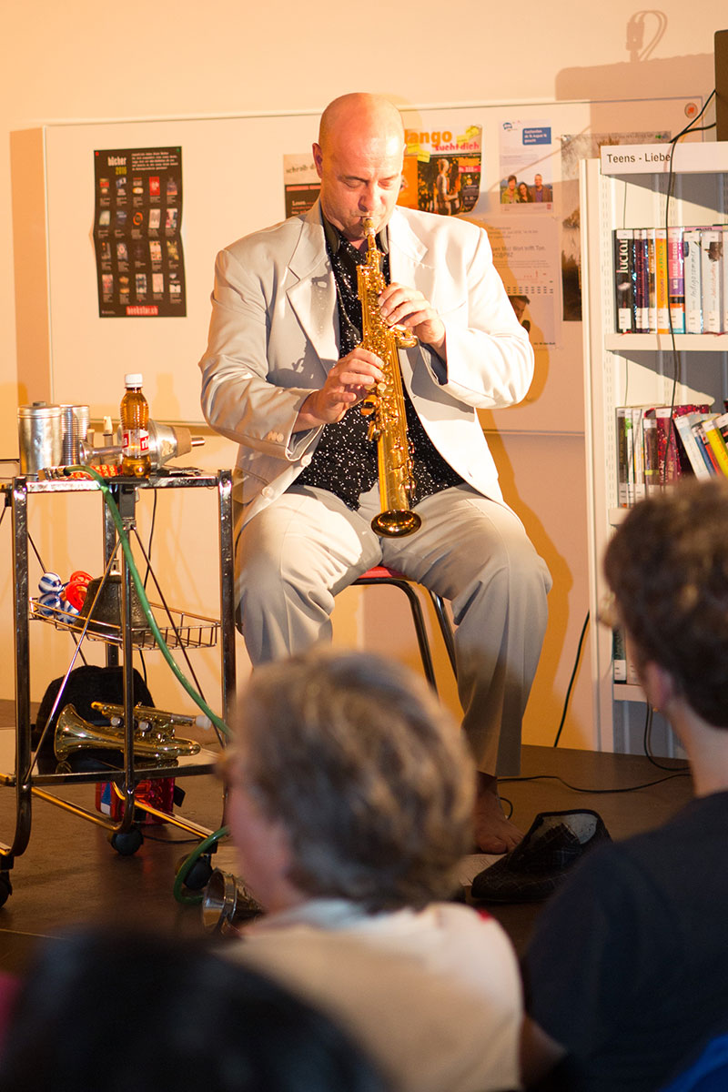 Urs Sibi Sibold untermalt und zaubert mit seinen Saxophonen, seiner Bassklarinette und anderen Instrumenten coole Sounds, Folklore-Resten und eigene jazzige Melodien, mal laut und kräftig groovig, mal fein und zartmelodiös zum Träumen. Das Doppelsax - Tenor und Sopransaxophon gleichzeitig im Mund spielend, ist eine seiner Spezialitäten und immer wieder ein Hinhörer und Hingucker. Er spielt alleine oder tritt in verschiedenen musikalischen Formationen auf.